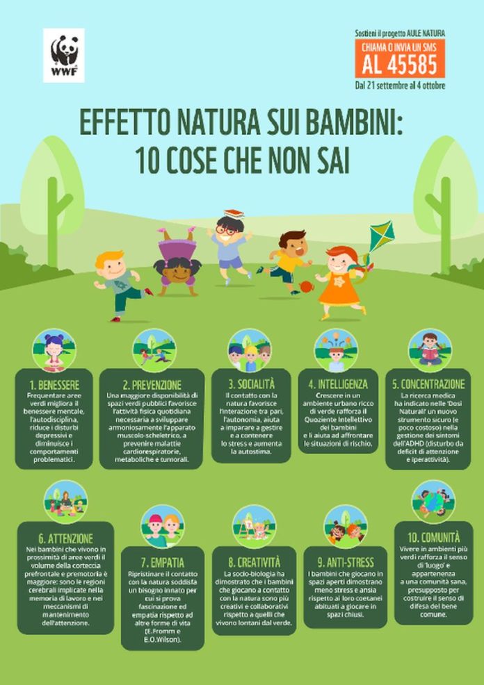 I benefici del contatto con la natura riassunti dal WWF in “10 cose che non sai” partono dal benessere, l’autodisciplina, la riduzione dei disturbi depressivi e dei comportamenti problematici per i bambini che frequentano aree verdi. Effetto natura anche nella prevenzione, poichè svolgere attività fisica all’aperto sviluppa in maniera armoniosa l’apparato muscolo-scheletrico, previene malattie cardiorespiratorie, metaboliche, tumorali. Il giocare in spazi aperti è anche un formidabile anti-stress e ‘ansioliticò, rispetto agli effetti del giocare in spazi chiusi. Crescere nella natura stimola anche la socialità, favorendo l’interazione tra pari, l’autonomia, contenendo lo stress e migliorando l’autostima. L’intelligenza è un altro dei fattori più influenzati dalla vita in un ambiente ricco di verde: secondo uno studio effettuato su un campione di bambini in Belgio e pubblicato nell’agosto di quest’anno su Plos Medicine il rafforzamento del quoziente intellettivo è uno degli effetti positivi del crescere in spazi urbani ricchi di verde, oltre all’abbassamento dei livelli di comportamenti problematici.