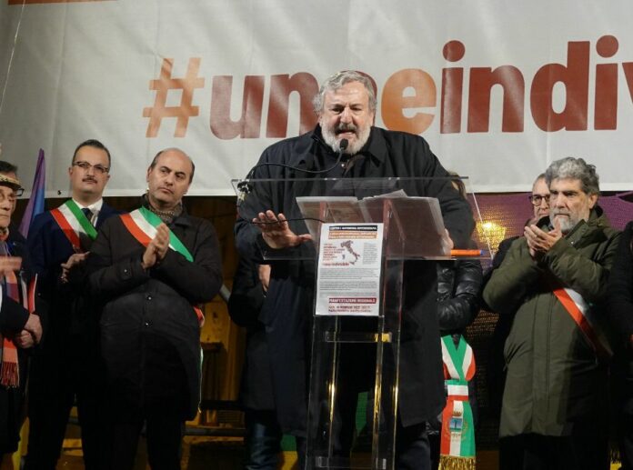 Parlando dal palco, rivolgendosi ai presenti, ha affermato: “Ricordate che la battaglia non è persa, vedo nelle vostre facce, come spesso è accaduto in passato, l’idea che questo processo non si possa fermare. Non è così. Sia pure con grande fatica, stasera le forze politiche del fronte progressista sono tutte qui e hanno quasi la timidezza di dire di essere qui, si guardano ancora con grande cautela, attendono chissà che cosa per convocare una Conferenza nazionale di tutti coloro che sono contro questo disegno di autonomia differenziata. Non abbiate paura di essere uniti”.