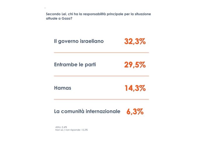 ROMA (ITALPRESS) – Il conflitto nella Striscia di Gaza sta richiamando sempre di più l’attenzione della politica e dell’opinione pubblica. L’escalation di attacchi e bombardamenti, fino all’ingresso dei tank israeliani a Gaza City, ha scatenato varie reazioni a vari livelli, dal singolo cittadino a personaggi pubblici ed esponenti politici. Secondo un sondaggio di Only Numbers, complessivamente due terzi della popolazione italiana ritengono gravissima la situazione umanitaria a Gaza, ritenendo di essere di fronte ad una crisi senza precedenti. Un altro quarto di popolazione, invece, giudica comunque seria la situazione anche se non ha molti elementi per giudicare con precisione. 1 italiano su 3 attribuisce le responsabilità di questa crisi al governo israeliano e al primo ministro Netanyahu, mentre quasi il 30% è orientato verso una responsabilità condivisa tra Israele ed Hamas.