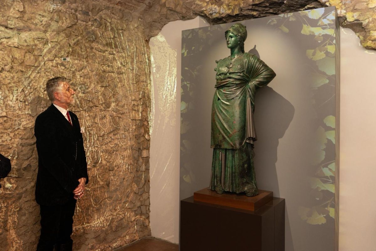 In questo quadro, la mostra di Arezzo dedicata alla Minerva non si limita al prestito della celebre scultura, ma si accompagna a interventi di rinnovamento strutturale e museografico di alcune sale del Museo Archeologico Nazionale “Gaio Cilnio Mecenate”, finalizzati a migliorare la qualità degli spazi, l’accessibilità e l’esperienza di visita. L’esposizione diventa così occasione per un investimento duraturo sul museo e sul territorio, coerente con le linee strategiche del Ministero della Cultura in materia di valorizzazione integrata e sostenibile. Cuore della mostra è l’esposizione della Minerva di Arezzo, uno dei grandi bronzi dell’antichità, ritrovata nel sottosuolo di Arezzo nel 1541, durante lo scavo di un pozzo presso San Lorenzo. La statua fu subito donata al duca Cosimo I de’ Medici, che la mise nel suo studio privato a Firenze. E da allora rimase nella città, come parte delle collezioni archeologiche granducali, che dal 1871 sono confluite nel Museo Archeologico Nazionale di Firenze per essere offerte alla fruizione di tutti gli italiani. Nella nuova esposizione al Museo di Arezzo, la Minerva è collocata in uno degli ambienti più suggestivi della sezione romana del Museo, dove viene raccontata attraverso una narrazione aggiornata e immersiva che ne ripercorre la scoperta, la fortuna collezionistica fiorentina e la complessa storia conservativa. La scultura (h. 150,5 cm; spessore medio del bronzo 4,5 mm) raffigura una dea Atena/Minerva con chitone, himation, egida con testa di Medusa ed elmo corinzio. Gli studi più recenti la riconducono a un originale ellenistico, databile ai primi decenni del III secolo a.C. (300-270 a.C. circa), forse prodotto in ambito italico o magnogreco.