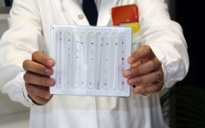 La striscia e’ numerata da 0 a 10, dove zero rappresenta la minima carica virale residua e 10 quella massima. Basta una goccia di sangue del paziente e in pochi minuti si coloreranno le tacche corrispondenti alla carica virale rilevata.