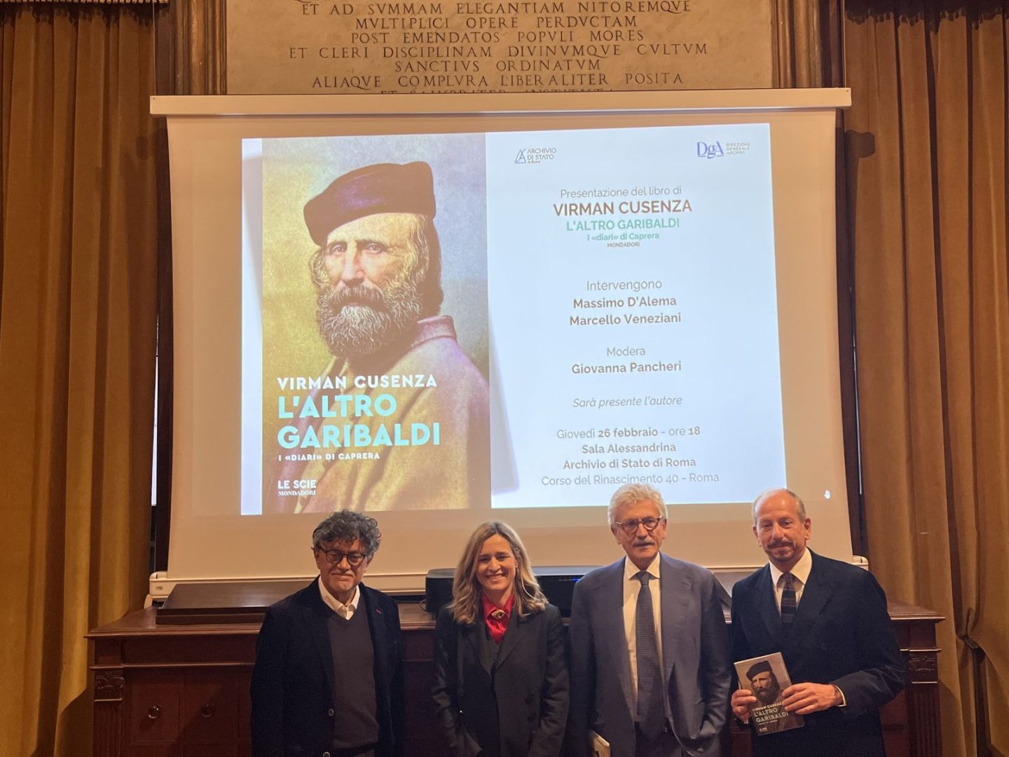 ROMA (ITALPRESS) – ‘L’altro Garibaldi. I “diari” di Caprera’, è il libro, edito da Mondadori, con cui Virman Cusenza, racconta aspetti della personalità del patriota, militare e politico italiano. Il libro è stato presentato nella Sala Alessandrina dell’Archivio di Stato a Corso del Rinascimento, a Roma. Oltre all’autore all’evento sono intervenuti l’ex presidente del Consiglio, Massimo D’Alema, e il giornalista e scrittore, Marcello Veneziani, moderati dalla giornalista Giovanna Pancheri.