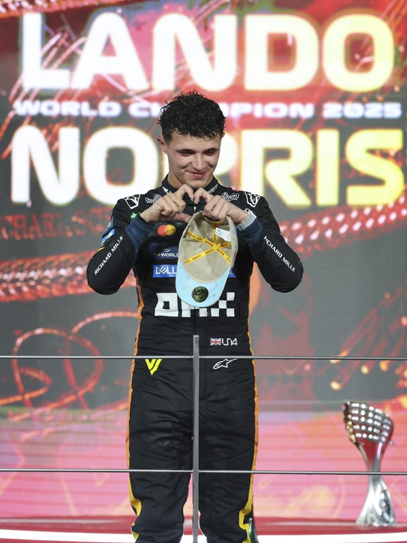 Questa foto d’archivio, scattata il 7 dicembre 2025, mostra il pilota britannico della McLaren Lando Norris mentre festeggia dopo il Gran Premio di Formula 1 di Abu Dhabi sul circuito di Yas Marina, ad Abu Dhabi, negli Emirati Arabi Uniti.