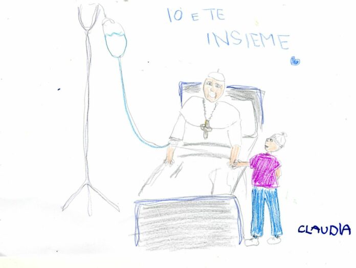 E ancora “Caro papa Francesco, preghiamo per te affinché il tuo ricovero sia più lieve” scrivono mamma Olga e Alessandro. “Io e te insieme”, nel suo disegno Claudia tiene la mano a Papa Francesco. Giulia, Eugenio, Evelina, Aldo, Amelia, Sofia, Alex e Nicole, invece, dedicano al pontefice una poesia: “Il papa in ospedale, ci fa stare tutti male, lo pensiamo poverino, che si sente malatino. Con affetto gli diciamo, forza Francesco per te preghiamo”.