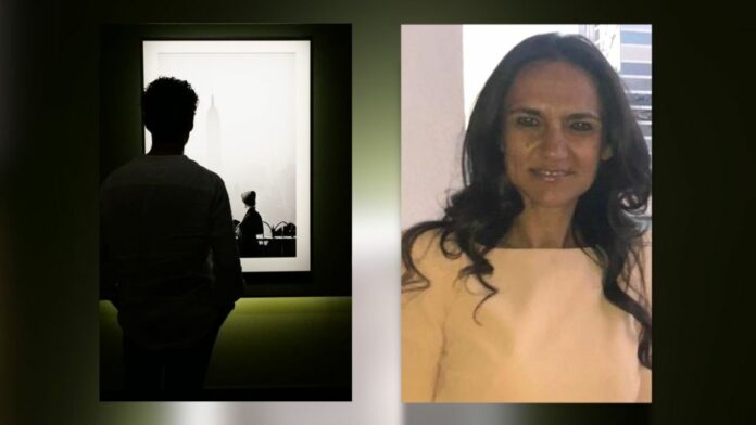 – foto ufficio stampa Fondazione Terzo Pilastro – Internazionale a sinistra una delle opere in mostra, a destra Alessandra Taccone –