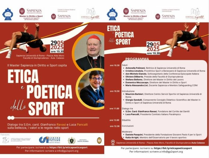 ROMA (ITALPRESS) – Dialogo su “Etica e Poetica dello Sport” tra il cardinale Gianfranco Ravasi e il presidente del Cip Luca Pancalli, ospiti del Master Sapienza in Diritto e Sport, giovedì 29 maggio dalle ore 10:15 in all’Università La Sapienza di Roma, Facoltà di Giurisprudenza, Aula Calasso (accesso libero).