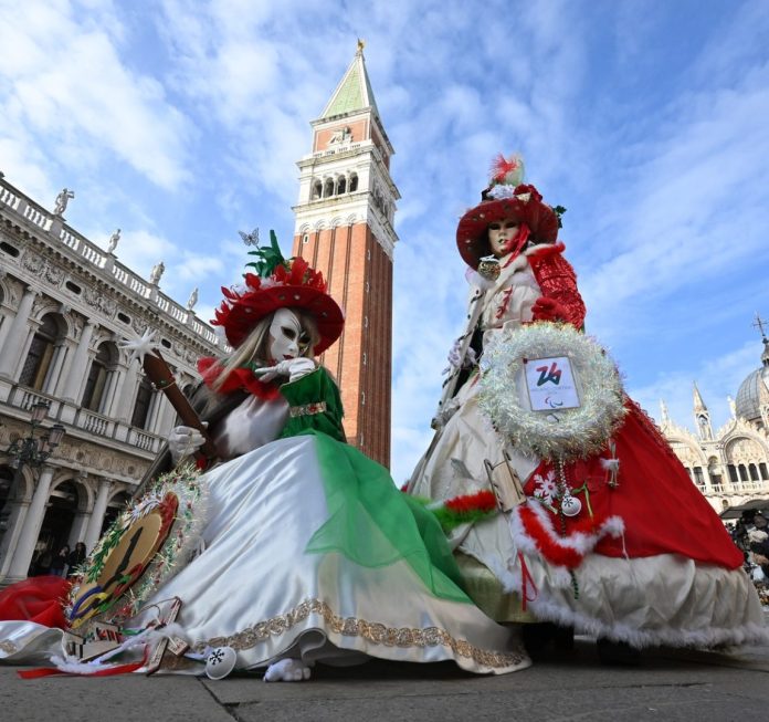 VENEZIA (XINHUA/ITALPRESS) – Partecipanti vestiti a tema Giochi olimpici invernali Milano-Cortina 2026 posano in Piazza San Marco durante il Carnevale di Venezia 2026 a Venezia, in Italia, il 31 gennaio 2026. L’edizione 2026 del tradizionale Carnevale di Venezia si svolge dal 31 gennaio al 17 febbraio.