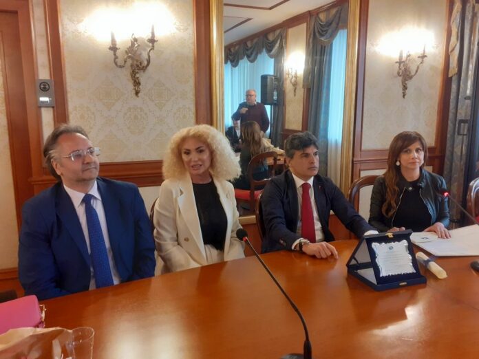 NAPOLI (ITALPRESS) – La designer napoletana Margherita Mazzei ha ricevuto stamane nel Salone di rappresentanza della sede del Consiglio regionale della Campania una targa di riconoscimento dal consigliere Pasquale Di Fenza, per aver valorizzato il made in Campania in ambito nazionale e internazionale. “La mia impresa esiste da 30 anni, nonostante nel Mezzogiorno fare impresa per una donna non sia così facile, sono voluta restare in questo territorio perchè sono fermamente convinta che al Sud si può fare comunque impresa, se si ha l’intraprendenza e la forza”, ha detto la stilista. “Attualmente – ha aggiunto – lavorano nella nostra impresa 15 dipendenti, e all’estero esportiamo prevalentemente a Dubai, negli Usa, ma solo nelle boutique specializzate, e anche in Europa vogliamo ulteriormente crescere”. Per Pasquale Di Fenza “è giusto che queste realtà imprenditoriali vengano riconosciute a livello regionale. E’ importante farle conoscere visto che con la pandemia hanno subito grosse difficoltà. E, in una terrà come la nostra – il riferimento del consigliere è al territorio di Giugliano, terrà d’origine della stilista – già martoriato dalla terra dei fuochi, queste sono belle realtà che vanno messe alla luce del sole”.