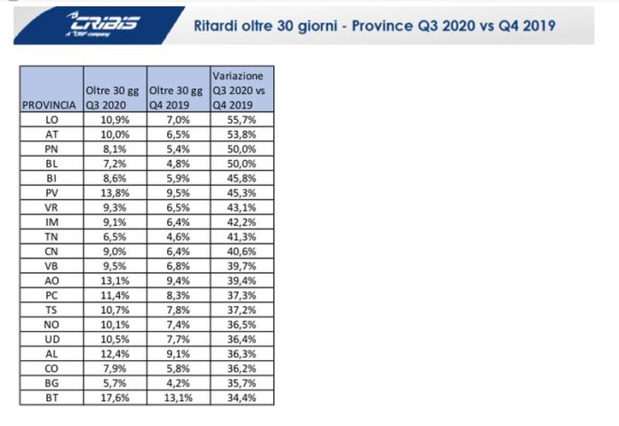 Continuano le ripercussioni economiche negative dell’emergenza Covid-19 sulla puntualità dei pagamenti delle imprese: a settembre il numero delle aziende italiane che pagano i propri fornitori con oltre 30 giorni di ritardo ha raggiunto il 12,7%, un dato di poco superiore a quello di fine 2016 (12,3%). È quanto emerge dallo Studio Pagamenti, aggiornato al 30 settembre , realizzato da CRIBIS, società del gruppo CRIF specializzata nella business information. Le regioni che hanno subito la variazione percentuale più elevata rispetto all’ultimo trimestre del 2019 sono la Valle d’Aosta (+40,4%), il Friuli-Venezia Giulia (+37,5%), il Veneto (+32,6%) e il Trentino-Alto Adige (+31,6%) che, nonostante questo, rimane la regione con meno ritardi gravi (6,7%) in assoluto. L’incremento dei ritardi oltre 30 giorni è invece più contenuto nelle regioni del Sud, che pur partono da un livello assoluto più elevato. Rispetto al trimestre precedente, il Nord Est e il Nord Ovest del Paese hanno registrato l’incremento più elevato di ritardi gravi (rispettivamente 10,4% e 11,8%). Il Nord Est tuttavia si conferma ancora una volta l’area geografica più affidabile, con il 43% delle imprese che pagano alla scadenza, mentre al Sud e nelle Isole, dove le imprese puntuali sono solo il 22,6%, si evidenziano maggiori difficoltà. “Dall’analisi dei dati – commenta Marco Preti, Ad CRIBIS – l’impatto negativo dell’emergenza sanitaria sulle nostre imprese è sempre più evidente. Adesso più che mai è fondamentale un’attenta gestione di fornitori o partner commerciali, per intervenire tempestivamente sulle situazioni in rapido deterioramento. Lo Studio – aggiunge Preti – rileva l’incremento più alto nei pagamenti superiori a 30 giorni rispetto a fine 2019 nel settore dell’industria, ma evidenzia anche lo stato di sofferenza dei settori più colpiti dal lockdown, quali bar e ristoranti, i servizi ricreativi e cinematografici, tutti agli ultimi posti nella classifica dei meno virtuosi nei pagamenti”. A livello territoriale la Sicilia, con il 23,1%, mantiene il primato negativo di imprese che effettuano i pagamenti con oltre 30 giorni di ritardo, seguita dalla Calabria (22,9%) e dalla Campania (20,6%). Il Trentino Alto-Adige (6,7%) e le regioni più colpite dall’emergenza sanitaria, vale a dire Emilia-Romagna (8,1%) e Lombardia (8,4%), sono, invece, quelle che registrano meno ritardi gravi, nonostante il notevole incremento rispetto a dicembre del 2019. L’indagine di CRIBIS evidenzia anche gli effetti della crisi generata dal Covid-19 sulle province del Nord: le imprese di Lodi (+55,7%), Asti (+53,8%), Pordenone (+50%) e Belluno (+50%) sono quelle che, a confronto con la fine del 2019, hanno registrato il maggior peggioramento nei pagamenti superiori ai 30 giorni. Nonostante l’incremento causato dalla crisi del Covid-19, Brescia, Sondrio, Bergamo, Lecco e Trento si confermano le province più puntuali, mentre il podio delle meno virtuose vede Reggio Calabria scavalcare Trapani all’ultimo posto, seguita da Palermo, Enna (fra le province italiane che, rispetto alla fine del 2019, perdono più posizioni – 8 – nel ranking) e Crotone. Per quanto riguarda i gruppi merceologici, il macrosettore che ha mostrato il maggiore incremento di ritardi oltre i 30 giorni è stata l’industria in cui il numero di aziende che pagano con grave ritardo è cresciuto del +25%, pur rimanendo in termini assoluti un settore con solo l’8,5% di aziende con questo profilo. Crescono molto i ritardi anche nel commercio all’ingrosso (+12,8% ritardi oltre 30 giorni); il settore però con il maggior numero in termini assoluti rimane il commercio al dettaglio con il 17,2% di aziende che pagano con ritardi superiori ai 30 giorni.