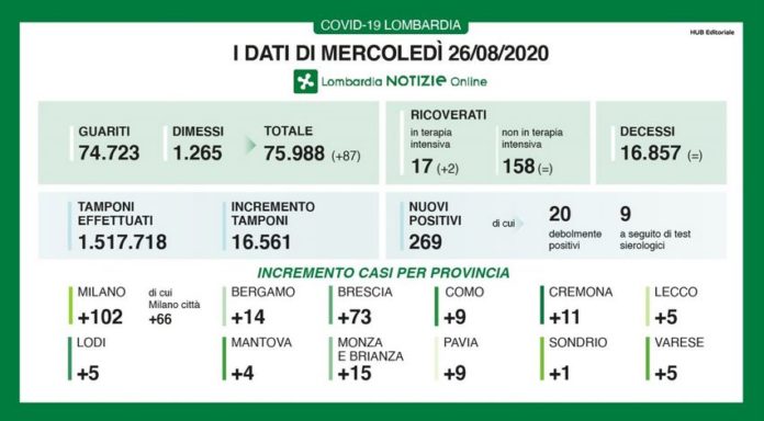 In Lombardia 269 nuovi casi di Covid, due terzi di rientro dall’estero