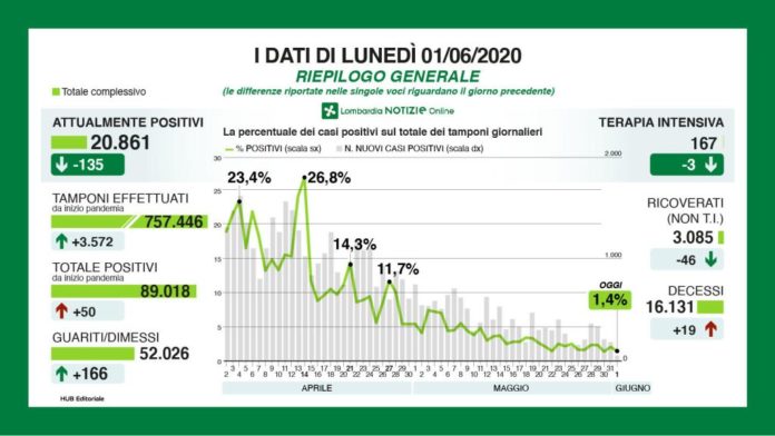 I dati sui nuovi contagiati vanno messi come sempre in relazione al numero dei tamponi effettuati: oggi 3.572 (ieri erano stati quasi il quadruplo 12.427). I guariti/dimessi oggi sono 166, in aumento rispetto a ieri quando erano 990. Prosegue il decremento dei ricoverati in terapia intensiva, oggi -3, su un totale di 167, e dei ricoverati in altri reparti, -46, per un totale di 3.085. Scende anche il numero di coloro che sono attualmente positivi al cororanvirus, 20.861, -135 odierni, rispetto a un totale complessivo dei positivi riscontrati in Lombardia dall’inizio della pandemia che a oggi ammonta a 89.018 casi.
