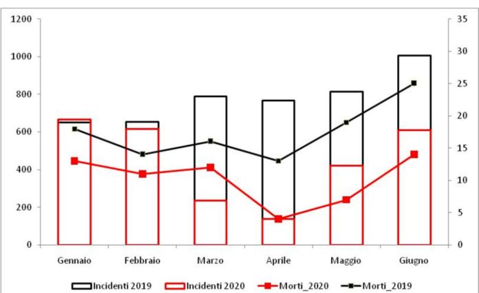 Nel bimestre marzo-aprile, mesi interessati dal lockdown, si è registrato un calo molto più accentuato con una riduzione del 75,9% per l’incidentalità stradale, del 44,8% per il numero di morti e del 79,1% per il numero di feriti. Nel bimestre maggio-giugno è stata registrato un decremento del 43,3% per l’incidentalità stradale, del 52,3% nel numero di decessi e del 47,4% del numero di feriti.