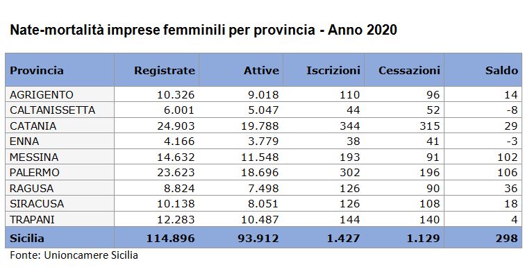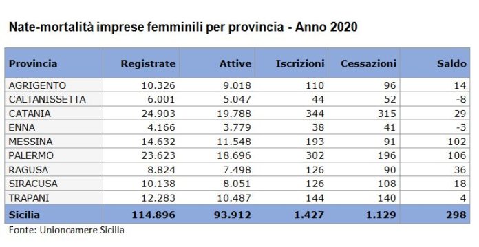 Sul fronte dei dati che riguardano la nate-mortalità delle imprese femminili nel 2020: Agrigento registrate 10.326, attive 9.018, iscrizioni 110, cessazioni 96, saldo 14; Caltanissetta registrate 6.001, attive 5.047, iscrizioni 44, cessazioni 52, saldo -8; Catania registrate 24.903, attive, 19.788, iscrizioni 38, cessazioni 41, saldo -3; Enna registrate 4.166, attive 3.779, iscrizioni 38, cessazioni 41, saldo -3; Messina registrate 14.632, attive 11.548, iscrizioni 193, cessazioni 91, saldo 102; Palermo registrate 23.623, attive 18.696, iscrizioni 302, cessazioni 196, saldo 106; Ragusa registrate 8.824, attive 7.498, iscrizioni 126, cessazioni 90, saldo 36; Siracusa registrate 10.138, attive 8.051, iscrizioni 126, cessazioni 108, saldo 18; Trapani registrate 12.283, attive 10.487, iscrizioni 144, cessazioni 140, saldo 4.
