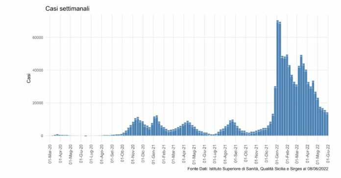 PALERMO (ITALPRESS) – Nella settimana dal 30 maggio al 5 giugno si registra in Sicilia ancora un decremento di nuovi casi di Covid, con un’incidenza pari a 14205 (-8.76%) e un valore cumulativo di 295.85/100.000 abitanti. Il tasso di nuovi positivi più elevato rispetto alla media regionale si è registrato nelle province di Siracusa (364/100.000 abitanti) e Palermo (329/100.000). Le fasce d’età più a rischio sono quelle tra gli 11 e i 13 anni, (417/100.000) e tra i 45 ed i 59 anni (319/100.000). Le nuove ospedalizzazioni aumentano lievemente. E’ quanto emerge dal bollettino settimanale a cura del dipartimento Asoe.