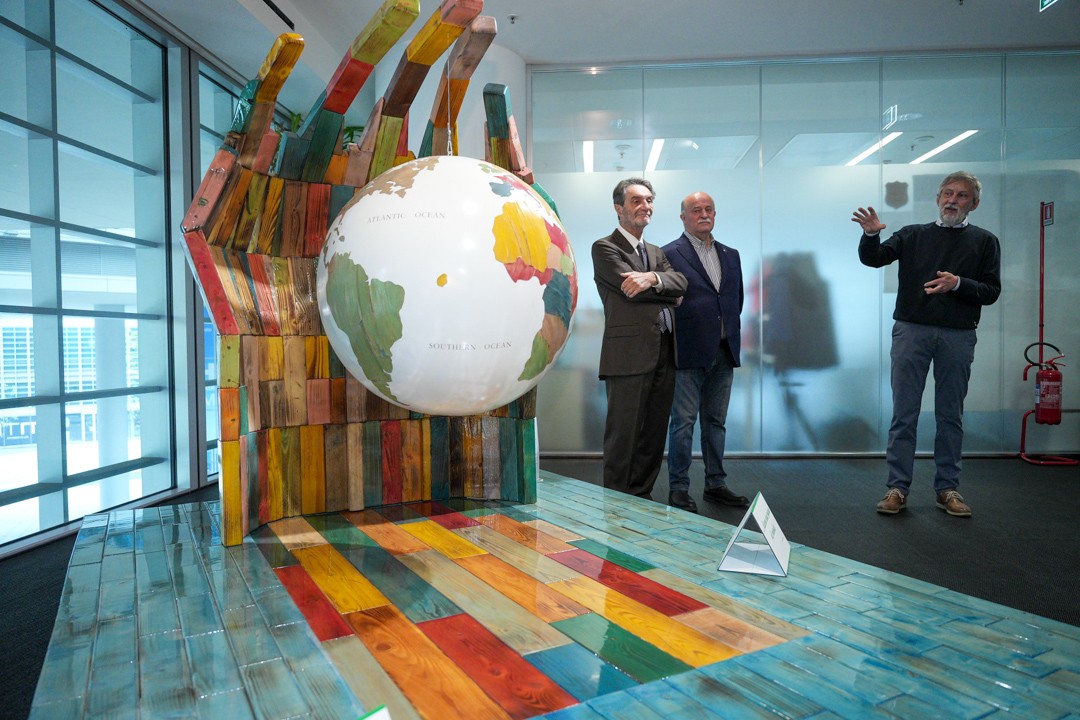 La scultura, realizzata da Mastro Olivardi, artista e storico volontario di Exodus, è composta da blocchi di legno riciclato (ex pallet) colorati, lucidati con resina e assemblati fino a formare una mano dalla quale pende un globo. Le assi di legno “sono frammenti di storie passate che si intrecciano in un gesto presente – ha detto lo scultore – Ogni colore, ogni forma geometrica rappresenta la diversità dei popoli, delle culture, delle storie che insieme compongono il tessuto umano del nostro pianeta”.