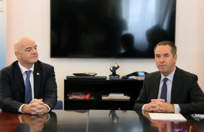 SAN MARINO (ITALPRESS) – Il segretario di Stato per lo sport di San Marino, Teodoro Lonfernini ha ricevuto questa mattina il presidente della Fifa, Gianni Infantino. Il dirigente italo-svizzero, che già in passato aveva visitato la Repubblica di San Marino, è stato accompagnato nella sua trasferta dal direttore delle Federazioni europee Elkhan Mammadov, dal consigliere e campione del mondo Youri Djorkaeff, dal dirigente dell’Ufficio del presidente Federico Raviglione e dall’ufficiale di collegamento con i media Alessandro Alciato. Presenti anche il presidente del Cons, Gian Primo Giardi, e i vertici della Federcalcio sammarinese, il presidente Marco Tura e il segretario generale Luigi Zafferani.