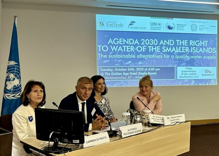 ATENE (GRECIA) (ITALPRESS) – E’ il buonsenso a dire che è arrivato il momento di abbandonare sistemi fortemente impattanti quando sono già disponibili nuove tecnologie, peraltro ampiamente usate in caso di emergenza dal Governo italiano, per fornire acqua di qualità alle Isole minori. E’ la crisi climatica globale a imporre di farlo subito, perchè disseminare le isole minori o interi arcipelaghi di dissalatori fissi, energivori e dannosi per gli ecosistemi costieri è una politica totalmente anacronistica. I dissalatori mobili marini, realizzati con tecnologia italiana, rappresentano al giorno d’oggi la soluzione più rapida, sostenibile, economica e sicura per ottimizzare la gestione dei piani di sicurezza e di fornitura dell’acqua potabile alle isole minori anche in caso di crisi, emergenze e maggiore richiesta idrica nella stagione turistica. Di questi temi si è parlato ad Atene in occasione del convegno “Agenda 2030 and the right to water of the smaller islands. The sustainable alternatives for a quality water supply”, promosso da Fondazione UniVerde, Fondazione Marevivo ETS, UNEP/MAP – United Nations Environment Programme / Mediterranean Action Plan (il Programma delle Nazioni Unite per l’Ambiente che coordina il Piano d’Azione per il Mediterraneo) con il patrocinio dell’Ambasciata d’Italia ad Atene e con la partecipazione dalla Vice capo Missione, Susanna Schlein.