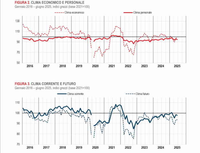 ROMA (ITALPRESS) – A giugno 2025 l’Istat stima una diminuzione dell’indice del clima di fiducia dei consumatori (da 96,5 a 96,1), mentre l’indice composito del clima di fiducia delle imprese sale da 93,1 a 93,9. “Tutte le serie componenti l’indice di fiducia dei consumatori sono in peggioramento eccetto i giudizi e le attese sulla situazione economica generale e le attese sulla disoccupazione – si legge in una not dell’Istituto di statistica –. I quattro indicatori calcolati mensilmente a partire dalle stesse componenti evidenziano variazioni eterogenee: il clima economico aumenta da 97,5 a 99,6; il clima futuro rimane stabile a 93,7, mentre il clima personale e quello corrente diminuiscono, rispettivamente, da 96,1 a 94,8 e da 98,6 a 97,9″.