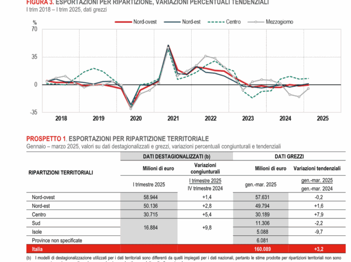 ROMA (ITALPRESS) – Nel primo trimestre 2025, l’Istat stima una crescita congiunturale delle esportazioni per tutte le ripartizioni territoriali: +9,8% per il Sud e Isole, +5,4% per il Centro, +2,8% per il Nord-est e +1,4% per il Nord-ovest. Nello stesso periodo, la crescita tendenziale dell’export nazionale in valore (+3,2%) è sintesi di dinamiche territoriali differenziate: le vendite all’estero aumentano per il Centro (+7,9%) e il Nord-est (+1,6%), sono pressoché stazionarie per il Nord-ovest (-0,2%), mentre flettono per le Isole (-9,7%) e il Sud (-2,2%) 1 . Nel primo trimestre del 2025, le regioni italiane che registrano gli incrementi tendenziali più marcati dell’export in valore sono: Friuli-Venezia Giulia (+26,1%), Lazio (+16,9%), Valle d’Aosta (+11,8%) e Toscana (+8,2%). All’opposto, le flessioni tendenziali più ampie delle esportazioni riguardano Sardegna (-16,8%), Marche (-11,6%), Basilicata (-10,4%), Molise (-9,2%) e Puglia (-8,4%).