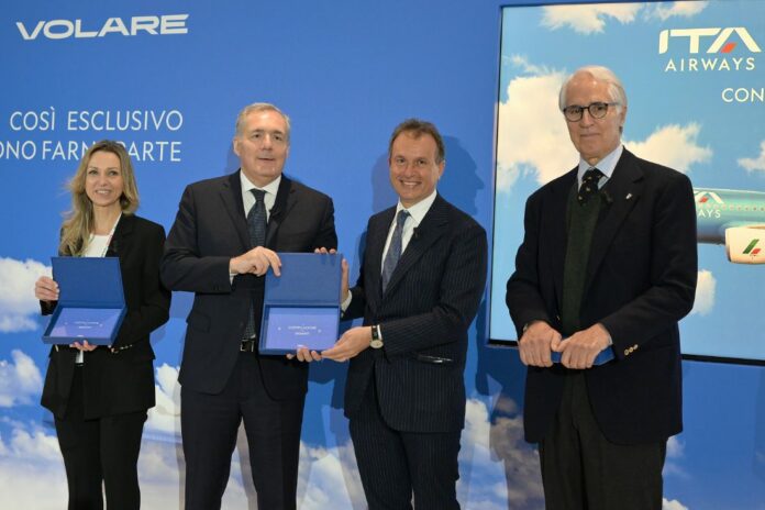 ROMA (ITALPRESS) – Il nuovo programma di fidelizzazione Volare, gli aerei con Livrea Azzurra e la lounge Piazza di Spagna di ITA Airways. Sono stati presentati oggi all’aeroporto di Roma Fiumicino da Alfredo Altavilla, presidente esecutivo della compagnia, e da Fabio Lazzerini, amministratore delegato di ITA, che hanno svelato i nomi dei campioni e campionesse azzurre a cui sono stati dedicati gli aerei. “Oggi abbiamo l’onore di ospitare tante grandi leggende del mondo dello sport, abbiamo deciso di legare il nostro mondo con quello dello sport perché il tifo nazionale unisce. Abbiamo dedicato i nostri aerei alle leggende dello sport che hanno fatto grande l’Italia, abbiamo cominciato con Paolo Rossi e Pietro Mennea, poi abbiamo aggiunto altri campioni e abbiamo lanciato un sondaggio sui social e i feedback che ci sono arrivati diventeranno i nomi dei nostri aerei. Questo è il nostro omaggio a chi ha fatto la storia del nostro sport ma soprattutto ai valori che rappresentano”, ha detto Lazzerini. “Nei primi mesi di vita siamo stati i primi per puntualità e per regolarità. Qualità del servizio, attenzione a bordo, puntualità e regolarità per noi sono fondamentali e tutto questo ci mostra che siamo sulla strada giusta e vogliamo continuare in questo senso”, ha aggiunto.