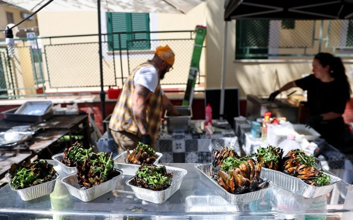 LADISPOLI (XINHUA/ITALPRESS) – Snack a base di carciofo sono esposti durante la sagra del carciofo romanesco a Ladispoli, in Italia, il 10 aprile 2026. La festa annuale che celebra il raccolto del carciofo romanesco si è aperta venerdì.