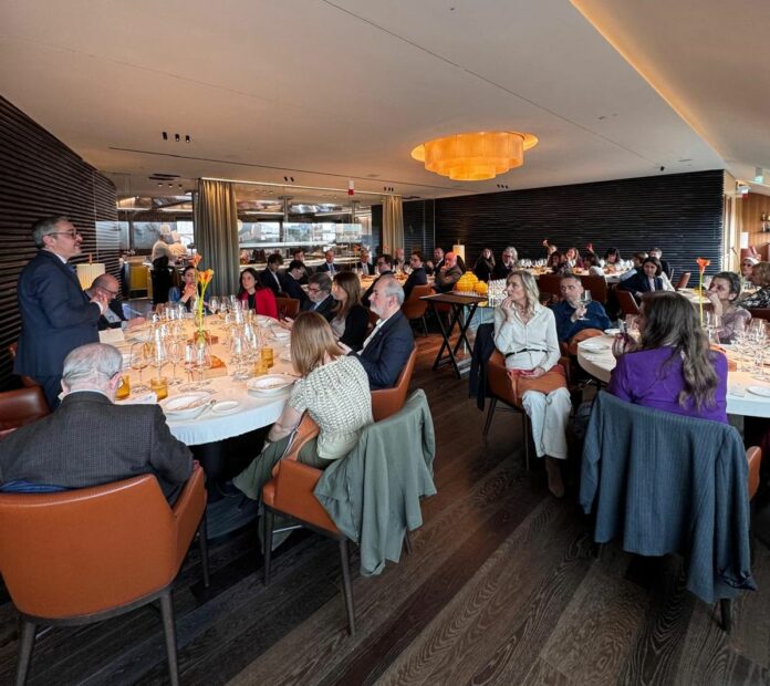 L’evento è stato un tributo ai sapori e alla tradizione del Made in Italy, con un menu esclusivo firmato dallo chef due stelle Michelin Andrea Aprea. Il percorso gastronomico – realizzato con i prodotti delle aziende aderenti al Consorzio Italia del Gusto – è iniziato con uovo Bio con patata, Grana Padano DOP e tartufo nero, accompagnato da Bellavista Franciacorta DOCG Pas Operè (2020); successivamente due sofisticati primi, riso carnaroli mantecato al cacio e pepe con fichi e gamberi e tortello genovese di manzo con provolone, scarola e olive nere; come secondo, faraona con cavolfiore, senape e camomilla e, ciliegina sulla torta, per finire gianduia e lamponi, babà con crema e amarena, cioccolatino al sale liquirizia e aceto balsamico tradizionale di Modena D.O.P. Ponti Extra Vecchio 25 Anni.