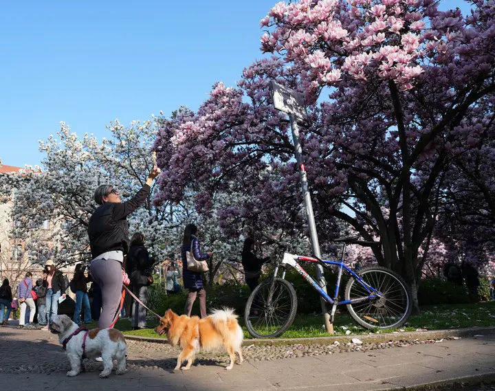 (XINHUA/ITALPRESS) – Queste foto, scattata il 13 marzo 2026, mostra le magnolie in fiore a Milano e alcune donne che le fotografano.