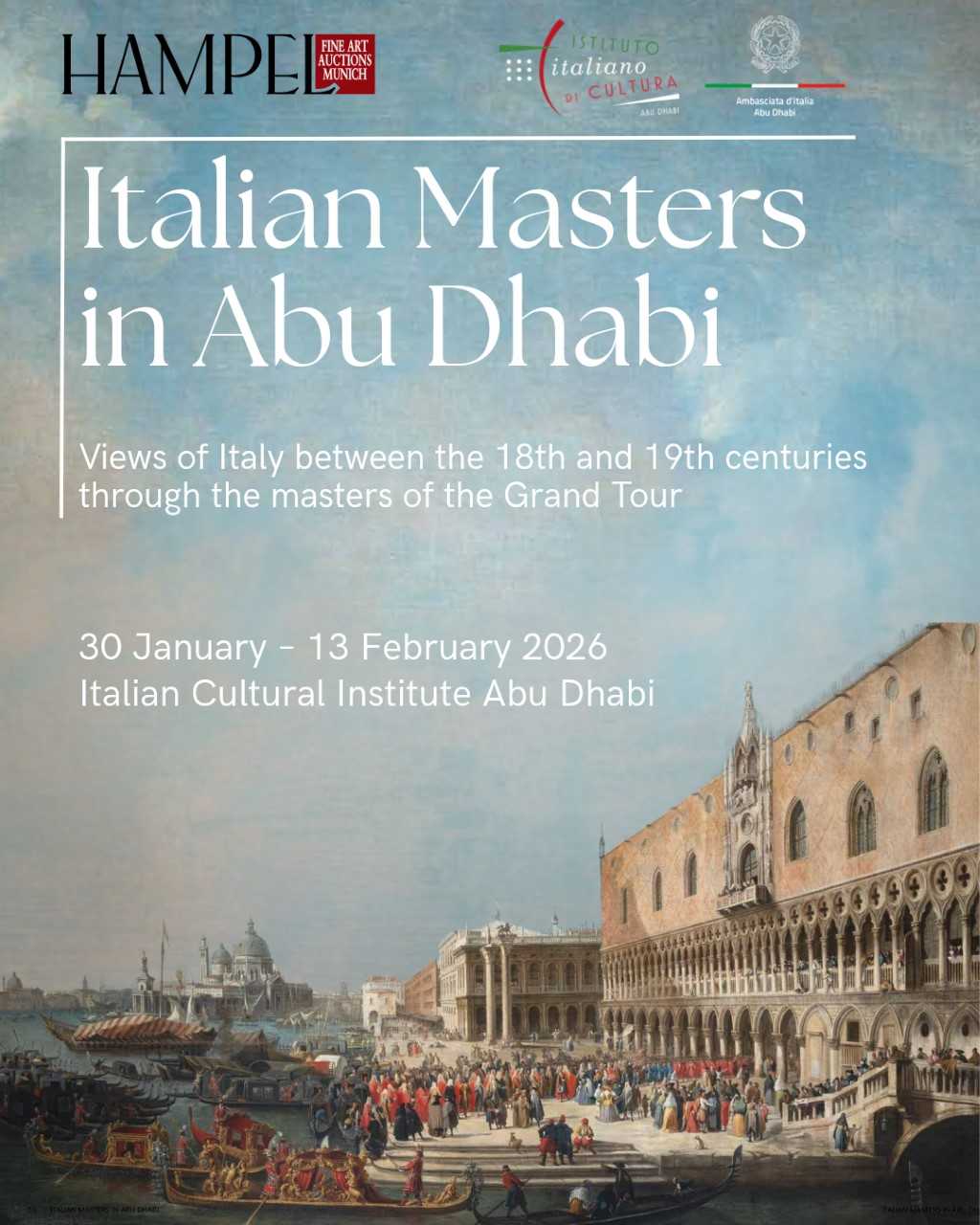 Il percorso espositivo riunisce opere di autori tra i più noti e amati della pittura di veduta, tra cui Canaletto, Francesco Guardi, Giovanni Paolo Panini, Vanvitelli, Ippolito Caffi e Thomas Patch, accanto ad altri protagonisti della stagione sette-ottocentesca. Ne emerge un racconto accessibile e coinvolgente, in cui le città italiane si trasformano in palcoscenici di storia, eleganza e meraviglia. La mostra è organizzata dall’Istituto Italiano di Cultura di Abu Dhabi, l’Ambasciata d’Italia negli E.A.U. e Hampel, una delle case d’aste leader d’Europa, con sede a Monaco di Baviera, apprezzata per la qualità delle proprie selezioni e per l’attenzione rivolta alla ricerca storico-artistica.