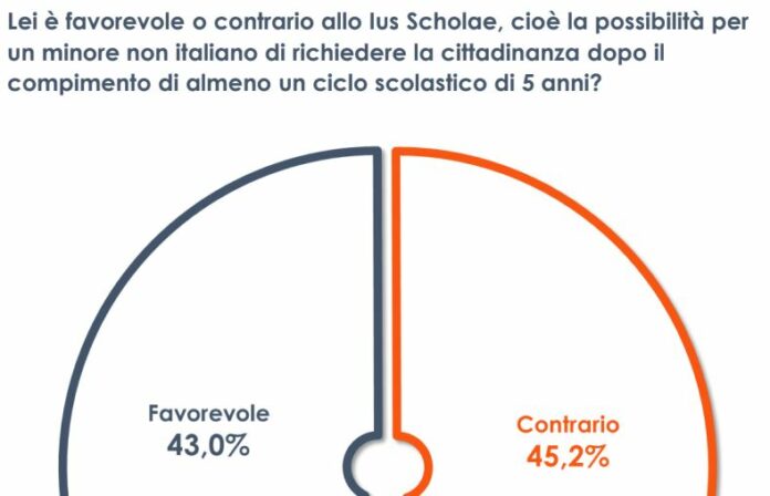 ROMA (ITALPRESS) – Negli ultimi giorni il dibattito politico italiano si è accesso sulla possibilità di introduzione dello Ius Scholae. Una norma che consenta la possibilità per un minore non italiano di richiedere la cittadinanza dopo il compimento di almeno un ciclo scolastico di 5 anni. Un argomento su cui la popolazione italiana risulta divisa tra favorevoli (43%) e contrari, con una leggera predominanza di quest’ultimi (45,2%). Le differenze di opinioni si evidenziano maggiormente nell’analisi degli aspetti socio-demografici e politici della popolazione. Da un punto di vista elettorale, infatti, da un lato troviamo l’area di centrosinistra che si dichiara favorevole allo Ius Scholae e, dall’altro, l’elettorato di centrodestra che in prevalenza si oppone a questa norma.