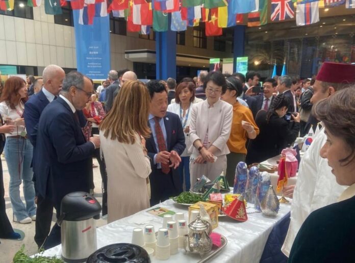 La Missione permanente del Regno del Marocco presso le agenzie delle Nazioni Unite con sede a Roma ha colto l’occasione per erigere uno stand con i colori del Regno, a testimonianza della ricchezza e della diversità della tradizione marocchina. Lo stand, accuratamente arredato in autentico spirito marocchino, comprendeva un salotto tradizionale dove i visitatori potevano scoprire e sperimentare l’arte ancestrale della preparazione del tè alla menta.