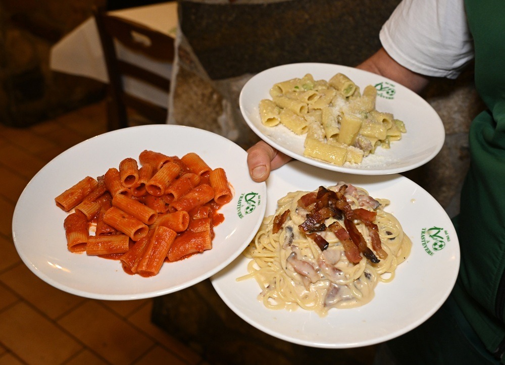 ROMA (XINHUA/ITALPRESS) – Questa foto, scattata l’11 dicembre 2025, mostra dei piatti di rigatoni all’amatriciana (a sinistra), spaghetti alla carbonara (in basso a destra) e rigatoni con broccoli e salsiccia in un ristorante chiamato Ivo a Trastevere, a Roma, in Italia. La cucina italiana è stata riconosciuta dall’Organizzazione delle Nazioni Unite per l’Educazione, la Scienza e la Cultura (UNESCO) come parte del patrimonio culturale immateriale mondiale, hanno annunciato mercoledì le autorità italiane