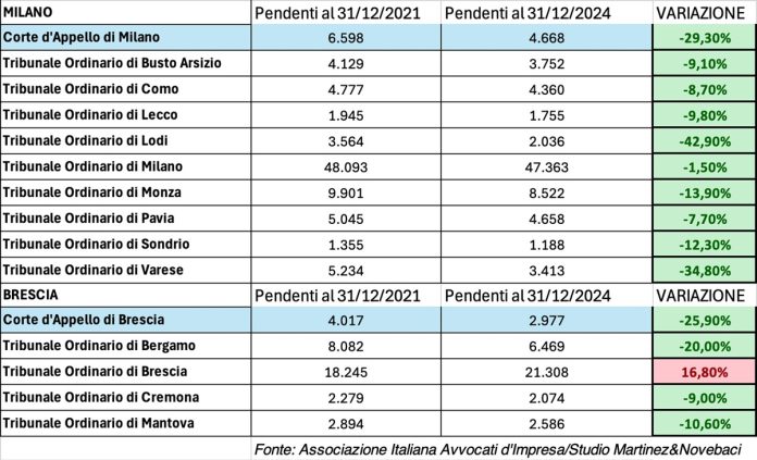 GIUSTIZIA: CAUSE CIVILI PENDENTI DIMINUISCONO SOPRATTUTTO A LODI E VARESE MILANO (ITALPRESS) – Nonostante tra il 2021 e il 2024, presso le Corti d’Appello italiane si sia registrato un calo medio del 24% dei procedimenti civili pendenti, in alcuni tribunali, soprattutto a Venezia (+159%) e Trieste (+73,7%) e L’Aquila (+48,5%), l’arretrato delle cause civili continua ad aumentare. È quanto emerge da un’analisi condotta dall’Associazione Italiana Avvocati d’Impresa, presieduta dall’avvocato Antonello Martinez.