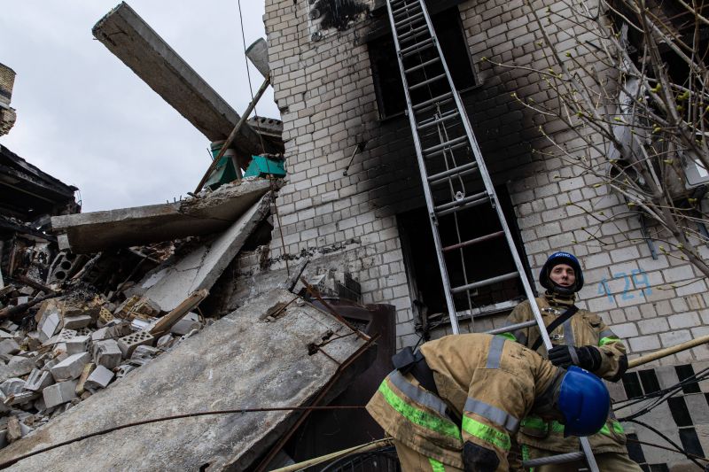 Ukrainian firefighters placing a ladder to search for survivors and corpses at the ruins of a destroyed residential building at Borodyanka, Kyiv Oblast. Following the recapture of Borodyanka by the Ukrainian forces, the city was heavily devastated and turned into ruins under intense fighting and shelling. (Pylypovychi - 2022-04-06, Alex Chan / SOPA Images / ipa-agency.net) p.s. la foto e' utilizzabile nel rispetto del contesto in cui e' stata scattata, e senza intento diffamatorio del decoro delle persone rappresentate