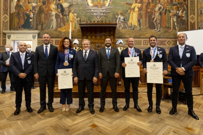 SAN MARINO (ITALPRESS) – I Capitani Reggenti Gian Carlo Venturini e Marco Nicolini hanno ricevuto in udienza Alessandra Perilli, Gian Marco Berti e Myles Nazem Amine Mularoni, gli atleti sammarinesi che hanno conquistato una medaglia ai Giochi Olimpici di Tokyo 2020, le prime della storia della Repubblica di San Marino. Presentati dal Segretario di Stato per lo Sport Teodoro Lonfernini, guidati dal Presidente del Comitato Olimpico Nazionale Sammarinese Gian Primo Giardi e accompagnati dall’intera delegazione sammarinese di Tokyo 2020 e dalle loro famiglie, i tre atleti hanno ricevuto il massimo encomio previsto per un cittadino sammarinese: la Medaglia al merito di prima classe. Insigniti dell’onorificenza di Cavaliere dell’Ordine Equestre di Sant’Agata i tecnici Luca Di Mari e Sergey Beloglazov rispettivamente tecnico del tiro a volo e tecnico della lotta.