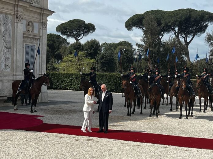 ROMA (ITALPRESS) – Re Carlo III è arrivato intorno alle 10.50 a Villa Doria Pamphilj, per l’incontro con la presidente del Consiglio Giorgia Meloni. A rendere gli onori al sovrano del Regno Unito di Gran Bretagna e Irlanda del Nord, giunto senza la regina Camilla, il Reggimento dei Lancieri di Montebello. Presenti, inoltre, il vice presidente del Consiglio Antonio Tajani e David Lammy, segretario di Stato per gli Affari esteri del Regno