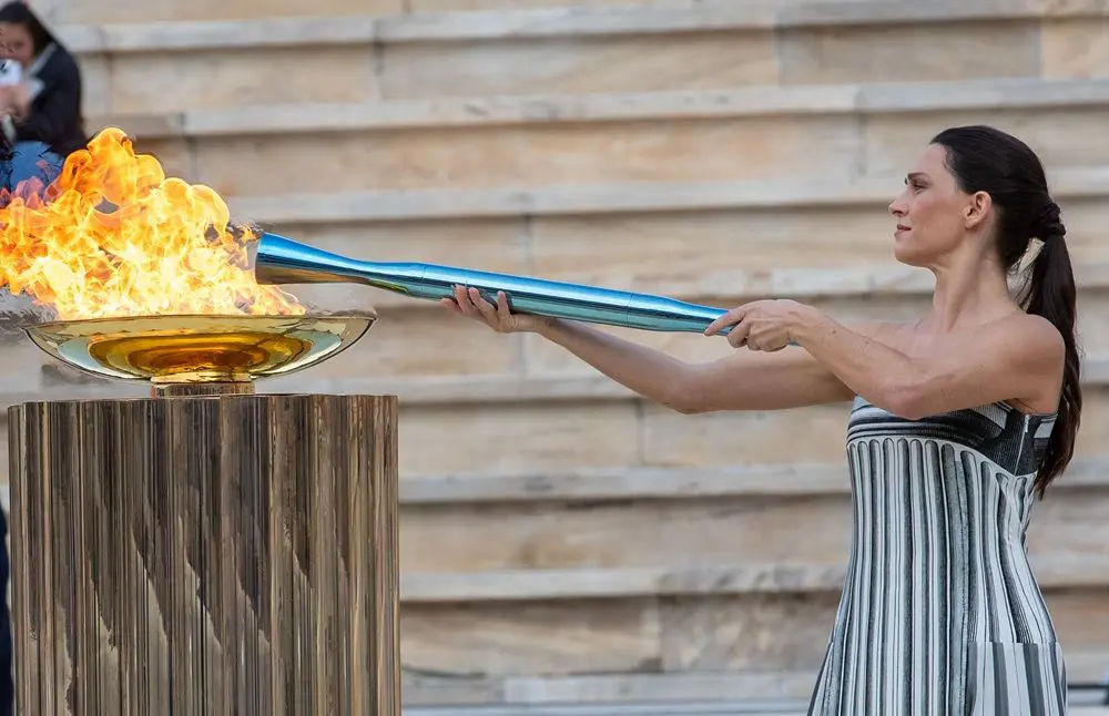 ATENE (GRECIA) (XINHUA/ITALPRESS) – L’attrice greca Mary Mina, nel ruolo di Alta Sacerdotessa, accende una torcia dal braciere durante la cerimonia di consegna della fiamma olimpica per i Giochi Olimpici Invernali di Milano-Cortina 2026 allo stadio Panatenaico di Atene, in Grecia, il 4 dicembre 2025.