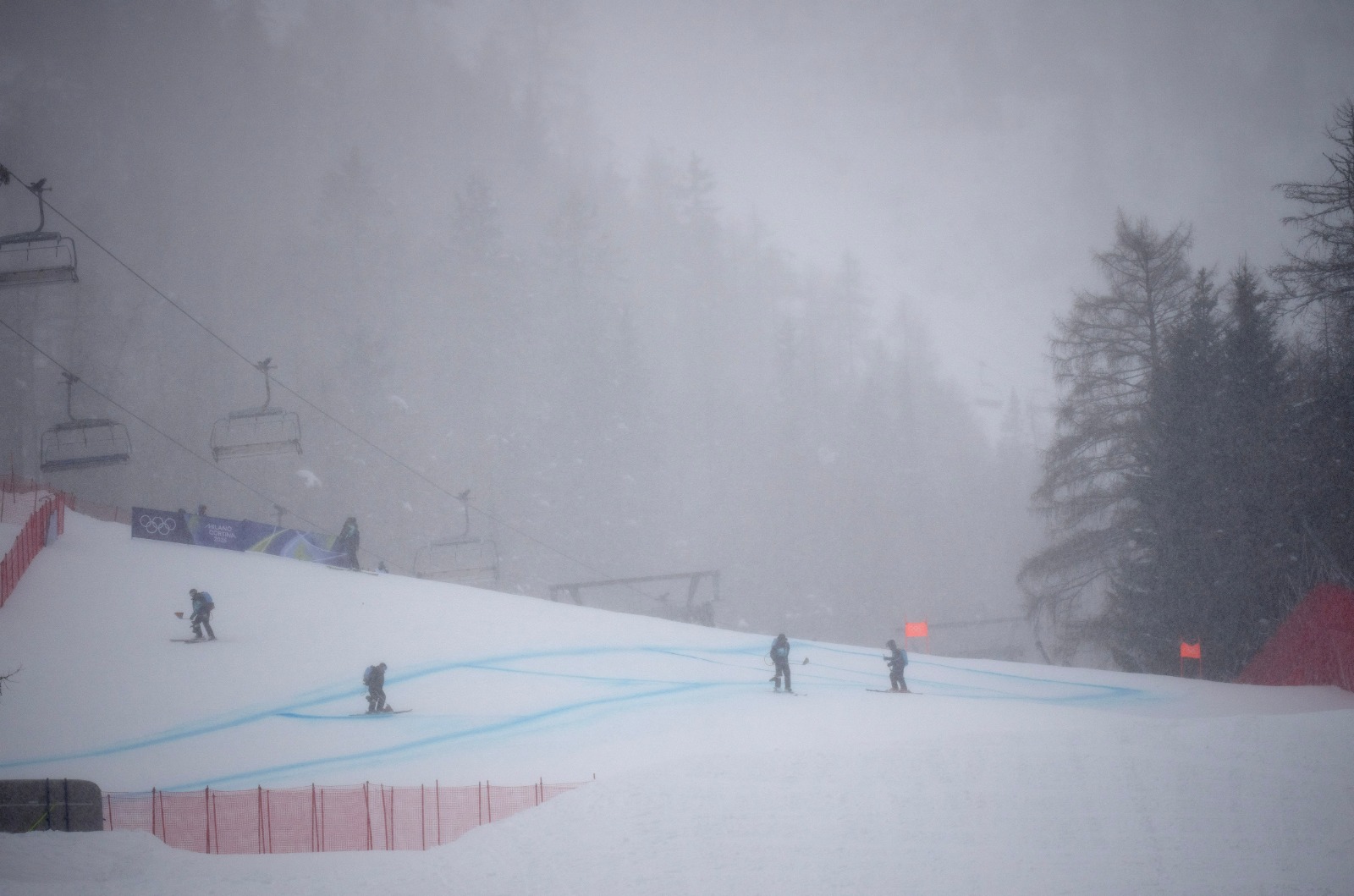 CORTINA D’AMPEZZO (XINHUA/ITALPRESS) – I membri dello staff lavorano sulla pista “Olimpia delle Tofane” di Cortina d’Ampezzo il 7 febbraio 2026. Sabato, la terza prova cronometrata della discesa femminile di sci alpino, ai Giochi Olimpici Invernali di Milano Cortina 2026, è stata interrotta a causa del maltempo.