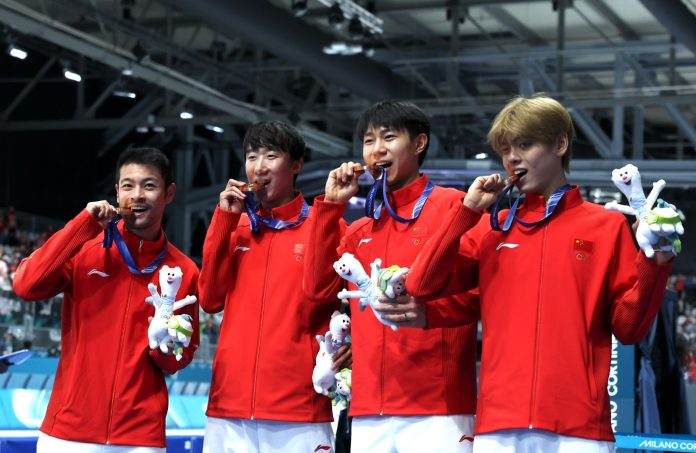 MILANO (XINHUA/ITALPRESS) – Gli atleti cinesi Liu Hanbin, Wu Yu, Li Wenhao e Ning Zhongyan mordono le loro medaglie dopo la cerimonia di premiazione della gara di inseguimento a squadre maschile di pattinaggio di velocità ai Giochi Olimpici Invernali di Milano-Cortina 2026, il 17 febbraio 2026.