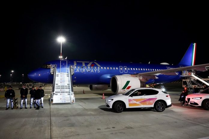 ROMA (XINHUA/ITALPRESS) – Un aereo della ITA Airways arriva con la fiamma dei Giochi Olimpici Invernali Milano-Cortina 2026 all’aeroporto di Fiumicino, a Roma, in Italia, il 4 dicembre 2025.