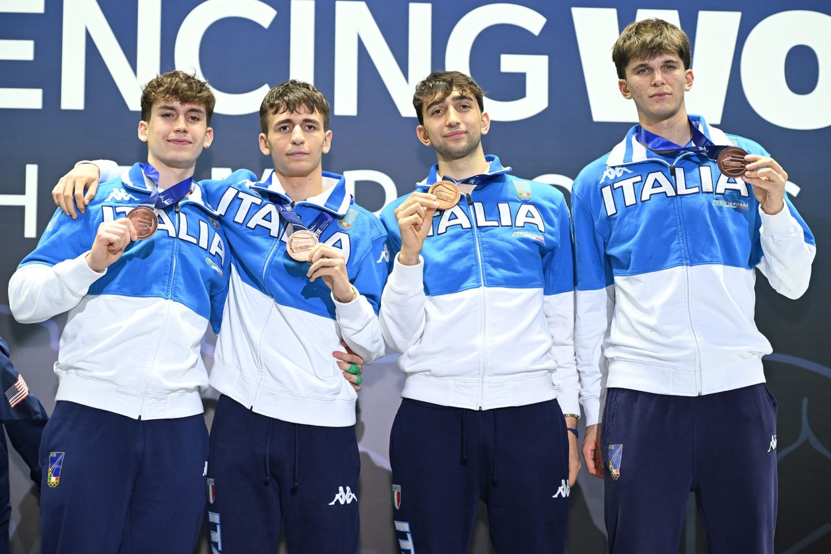 RIO DE JANEIRO (BRASILE) (ITALPRESS) – La sesta giornata del Mondiale Giovani e Cadetti di Rio de Janeiro regala all’Italia la quarta medaglia di bronzo firmata dalla squadra di fioretto maschile. Mattia De Cristofaro, Emanuele Iaquinta, Mattia Conticini ed Elia Pasin hanno conquistato nella notte italiana il terzo gradino del podio superando la Gran Bretagna, reagendo alla sconfitta rimediata in semifinale contro la Francia. Il quartetto italiano ha esordito superando 45-21 l’Ecuador e, negli ottavi di finale, ha battuto l’Ucraina con il punteggio di 45-32. I ragazzi guidati in panchina dal ct Simone Vanni, affiancato dal maestro Alberto Dei Rossi, sono riusciti a portare a casa anche il quarto di finale contro il Giappone, vincendo per 45-41 e approdando così in semifinale. Qui, opposta alla Francia, in un assalto duro e di grande intensità, l’Italia ha ceduto con il risultato di 45-40 che ha dirottato gli azzurrini alla finale per il bronzo. Nell’ultimo match, contro la Gran Bretagna, i fiorettisti italiani hanno servito il pronto riscatto. Dopo un avvio non semplice, gli azzurrini hanno ripreso in mano l’incontro, chiudendo con il verdetto di 45-35 che ha portato Mattia De Cristofaro, Emanuele Iaquinta, Mattia Conticini ed Elia Pasin sul terzo gradino del podio iridato.