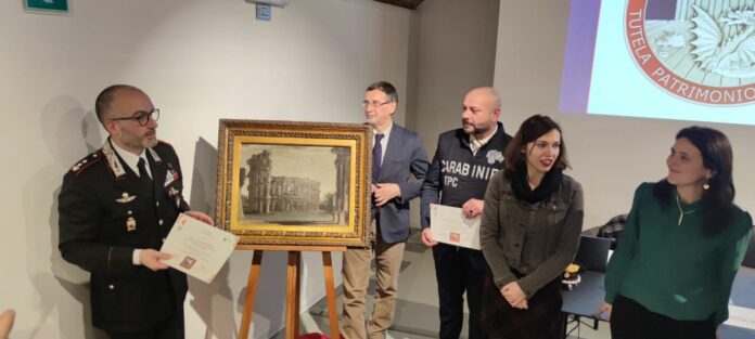 MILANO (ITALPRESS) – E’ stato riconsegnato oggi ai Musei Civici di Monza un dipinto risalente al XVII secolo, realizzato con la tecnica dell’olio su tavola, raffigurante il Colosseo, di cui si erano perse le tracce dal 1974. L’opera, che all’epoca era custodita nella Pinacoteca Civica della Villa Reale di Monza, era stata sottratta, insieme ad altre 10 tele d’autore, per un valore stimato di circa 10 milioni di lire. Le verifiche condotte dai carabinieri del Nucleo TPC di Monza attraverso la consultazione della “Banca Dati dei beni culturali illecitamente sottratti”, il più grande database al mondo di opere d’arte rubate gestito dal Comando TPC, hanno così consentito accertare la corrispondenza tra la tavola in vendita sul sito di una casa d’aste milanese a 8000 euro e quella censita nel sistema informatico. Le indagini, coordinate dall’Autorità Giudiziaria di Varese, hanno consentito di confermare in pieno l’ipotesi investigativa dei Carabinieri e accertare che quanto avevano individuato nella rete fosse proprio ciò che era stato trafugato da Monza nella notte tra il 6 ed il 7 giugno 1974. Il dipinto rappresenta una veduta del Colosseo dalla parte più diroccata, con l’edificio in stato di abbandono ricoperto in parte dalla vegetazione. Sul lato destro del quadro appare una parte di colonnato classico, anch’esso in rovina, mentre sullo sfondo, a sinistra, si nota parte di un muraglione e un piccolo edificio, simile a una porta o a una facciata di chiesa di gusto barocco, con volute e timpani triangolari. L’opera è pervenuta al Comune di Monza dal lascito testamentario di Eva Galbesi Segrè del 1923, senza indicazioni sull’autore. Risulta esposta in Pinacoteca, nella sede in Villa Reale, già nel 1945; successivamente gli inventari segnalano alcuni spostamenti all’interno delle sale, sino al furto denunciato il 7 giugno 1974.