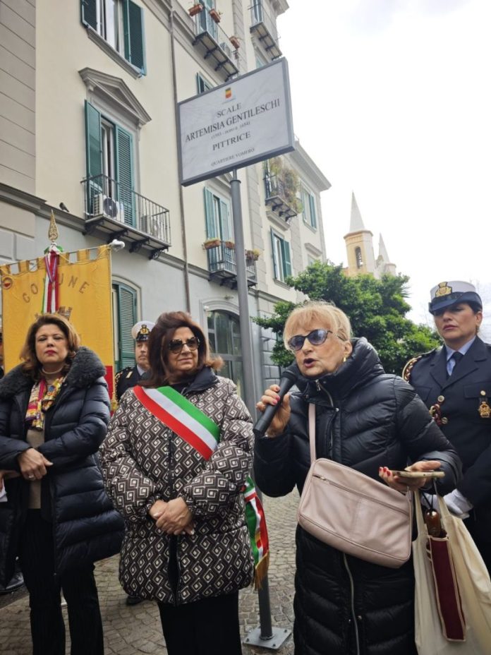 A margine dello svelamento della targa, la consigliera comunale Mariagrazia Vitelli ha affermato: “Artemisia Gentileschi seppe ribellarsi a quello che era il ruolo a cui gli uomini relegavano le donne nel ‘600 ed ebbe la forza di far sì che la violenza subita da un amico del padre non diventasse la rovina della sua vita, ma il punto di partenza di una riscossa come donna. Ed è questo ciò che ha insegnato alle sue figlie e alle donne della sua generazione. Come pittrice le furono affidate commissioni importantissime e difficili, che seppe portare a termine con grande bravura. Trasferitasi a Napoli, la nostra città divenne la sua patria definitiva”.