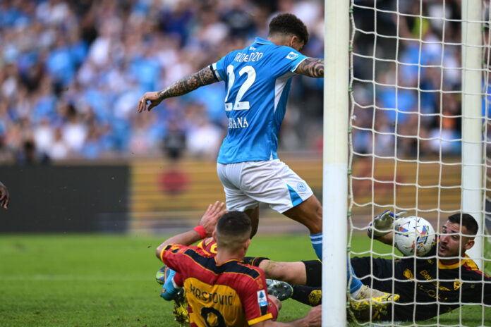 il Napoli su tiro di Banda. Partita che si accende. Al 33′ si vede anche il Lecce con una ripartenza di Krstovic per Pierotti,