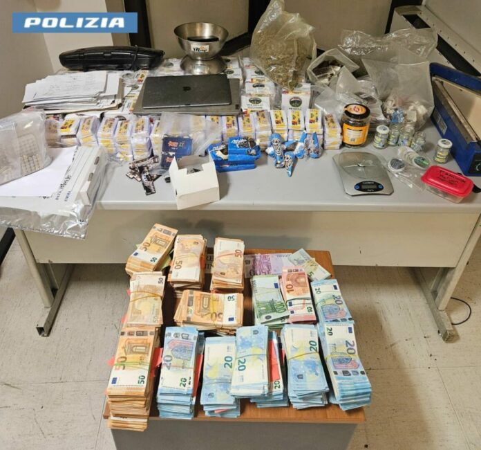 Dal bilancio del materiale sottoposto a sequestro risultano anche 8 cellulari, materiale per il confezionamento e due quaderni verosimilmente utilizzati per tracciare le vendite. Il giovane è stato arrestato per detenzione e spaccio di sostanze stupefacenti e porto abusivo di arma. L’arresto è stato convalidato dal gip.