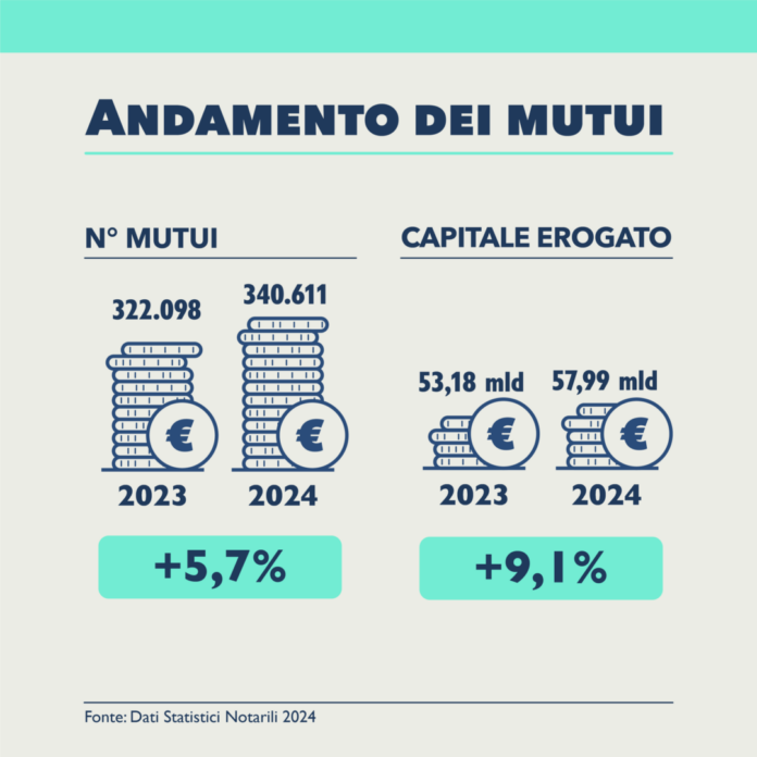 Anche nel 2024 le compravendite effettuate da privati sono maggiori rispetto a quelle da imprese. Questo vale sia per gli immobili abitativi, venduti da privati nell’87,46% dei casi Nel 2024, il settore dei mutui è in recupero rispetto alla forte flessione registrata nell’anno precedente. Dopo il calo del 26% osservato tra il 2022 e il 2023, le nuove rilevazioni evidenziano un aumento complessivo dei mutui del 5,7% su base annua, portando il numero dei finanziamenti erogati nel 2024 a 340.611 (contro i 322.098 del 2023). Non si è ancora tornati ai livelli pre-pandemici (erano stati registrati 396.779 mutui nel 2019), ma l’inversione del trend suggerisce un quadro in miglioramento, sebbene ancora condizionato dall’andamento dei tassi di interesse e dall’incertezza economica.