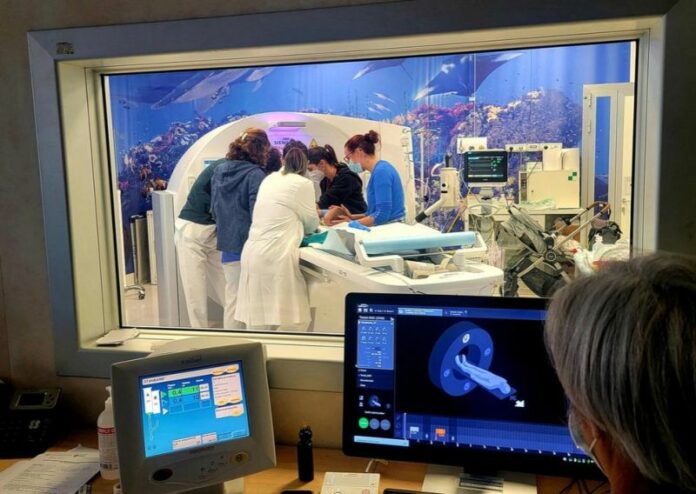 MILANO (ITALPRESS) – Affrontare una malattia è un peso per chiunque, specialmente per i bambini. Ma “galleggiare” tra i fondali marini, grazie a visori 3D e ad ambienti immersivi, questo peso lo può alleggerire almeno un pò. Al Policlinico di Milano nasce così un nuovo percorso dedicato ai bimbi che devono fare esami diagnostici: l’ansia e il disagio di una TAC, ad esempio, vengono quasi annullati grazie ad un viaggio tematico che inizia già dalla sala d’attesa, dove immagini proiettate sulle pareti, suoni e musiche d’effetto rendono l’immersione realistica, e allo stesso tempo riducono di molto il disagio delle cure.
