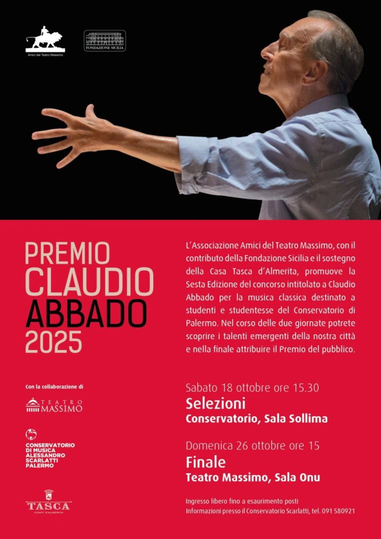 PALERMO (ITALPRESS) – Domenica 26 ottobre, con inizio alle ore 15.00, avranno luogo al Teatro Massimo in Sala ONU il concerto finale e la premiazione dei vincitori della VI edizione del premio dedicato a Claudio Abbado. L’iniziativa è promossa e organizzata dall’Associazione “Amici del Teatro Massimo” in collaborazione con il Conservatorio Alessandro Scarlatti di Palermo e la Fondazione Teatro Massimo, con il contributo della Fondazione Sicilia e il sostegno della Casa Tasca d’Almerita.