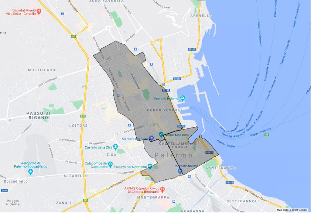 – Quartiere Palazzo Reale Monte di Pietà il cui perimetro è fissato nelle seguenti vie: – Corso Tukory – Corso Re Ruggero – Piazza Indipendenza – Corso Calatafimi – Vicolo a Porta Nuova – Corso Alberto Amedeo – Piazza Vittorio Emanuele Orlando – Via Volturno – Piazza Giuseppe Verdi – Via Maqueda ricadente nella 1^ Circoscrizione.