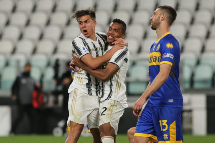 Photo LiveMedia/Claudio Benedetto Turin, Italy, April 21, 2021, Italian football Serie A match Juventus FC vs Parma Calcio Image shows: Paulo Dybala (Juventus FC) celebrates the gial of Alex Sandro Lobo Silva (Juventus FC) LiveMedia - World Copyright