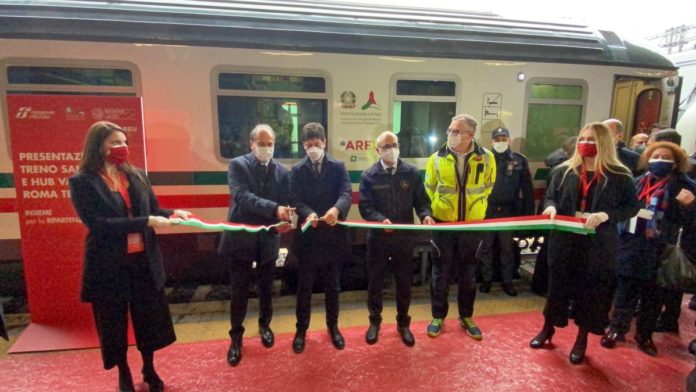 ROMA (ITALPRESS) – Un treno sanitario equipaggiato per la cura e il trasporto dei pazienti durante emergenze o le calamità, un hub delle vaccinazioni per contrastare il Covid-19, a piazzale dei Cinquecento, è un treno Covid Free nella tratta Roma-Milano, questa la strategia messa in campo da Ferrovie dello Stato in collaborazione con Dipartimento della Protezione Civile, Regione Lazio, Croce Rossa Italiana e Agenzia Regionale Emergenza Urgenza della Lombardia. Presentato questa mattina dall’amministratore Delegato e Direttore Generale di FS Italiane, Gianfranco Battisti e dal Ministro della Salute Roberto Speranza, a cui hanno partecipato tra gli altri il Presidente della Regione Lazio Nicola Zingaretti e il Presidente Nazionale della Croce Rossa Italiana Francesco Rocca. “Come Ferrovie dello Stato ci siamo contraddistinti in questa fase di pandemia. Il gruppo, come tutte le imprese di trasporto e del turismo è stato al centro di questa crisi sanitaria e economia ma sin dai primi momenti ci siamo attivati per dare una mano con gli approvvigionamenti di medicinali e alimentari” ha ricordato Battisti prendendo per primo la parola.